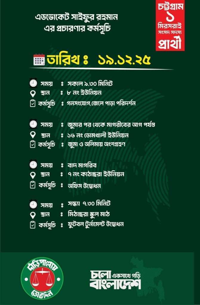 গণপ্রজাতন্ত্রী বাংলাদেশ সরকারের ডেপুটি অ্যার্টনি জেনারেল ও চট্টগ্রাম-১ (মিরসরাই) আসনে Bangladesh Jamaat-e-Islami মনোনীত সংসদ সদস্য প্রার্থী তারুণ্যের আইডল জননেতা Adv Saifur Rahman এর আগামীকালের কর্মসূচী।