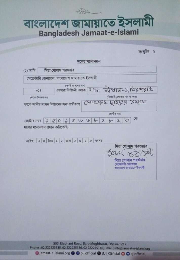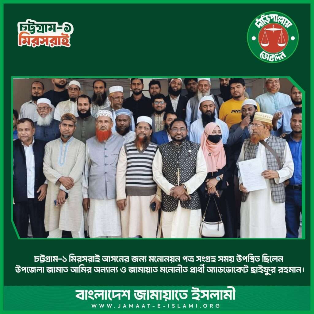 সন্মানিত দেশবাসী, প্রিয় মীরসরাই বাসী, আচ্ছালামু আলাইকুম। বাংলাদেশ জামায়াতে ইসলামীর মহাসচিব জনাব মিয়া গোলাম পরওয়ার কতৃক স্বাক্ষরিত দলীয় মনোনয়ন চট্টগ্রাম -১ মীরসরাই আসনের চিঠিটি সংশ্লিষ্ট দায়িত্বশীলের হাতে পৌঁছেছে। ইনশাআল্লাহ আগামীকাল মীরসরাই উপজেলা নির্বাহী অফিসারের কার্যালয়ে নির্বাচন কমিশনের বিধি মোতাবেক যথারীতি দাখিল করা হবে। আমি মীরসরাইবাসী সহ দেশবাসীর নিকট দোয়া চাই